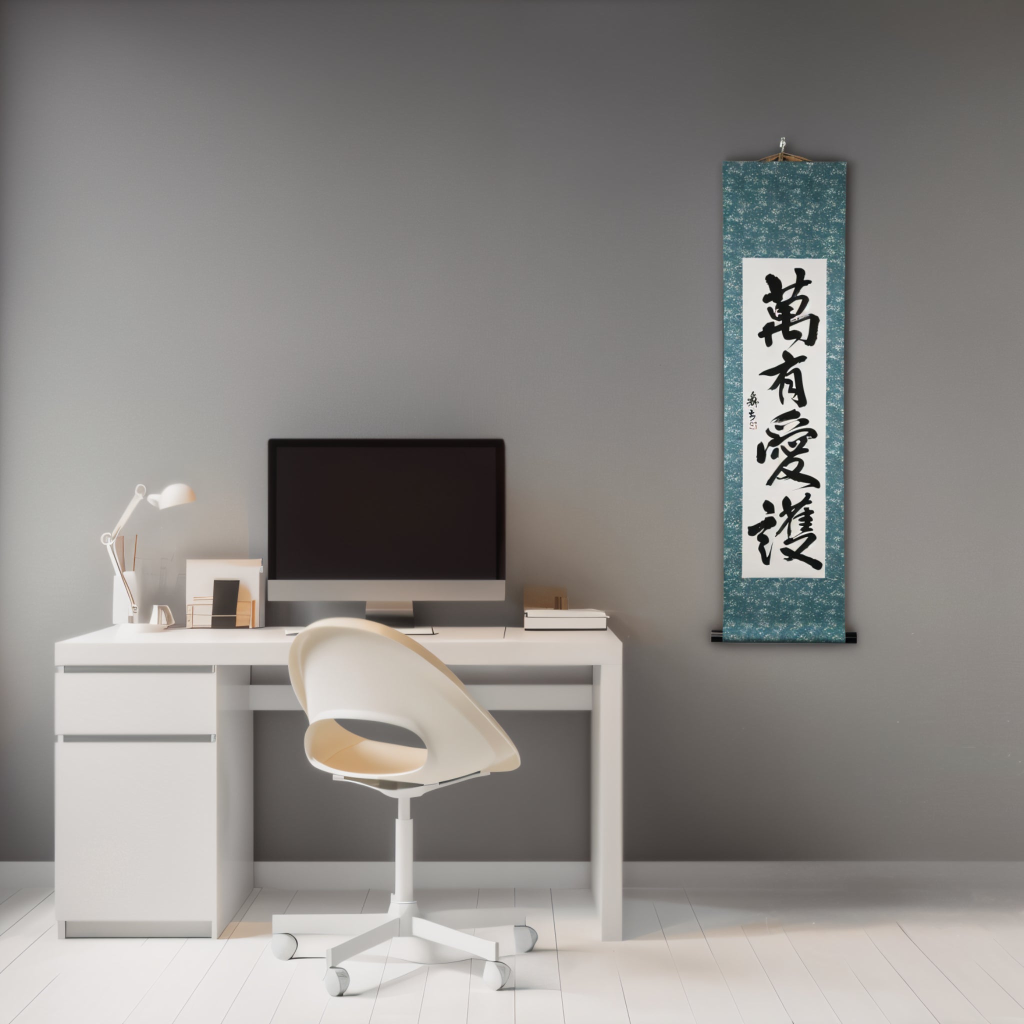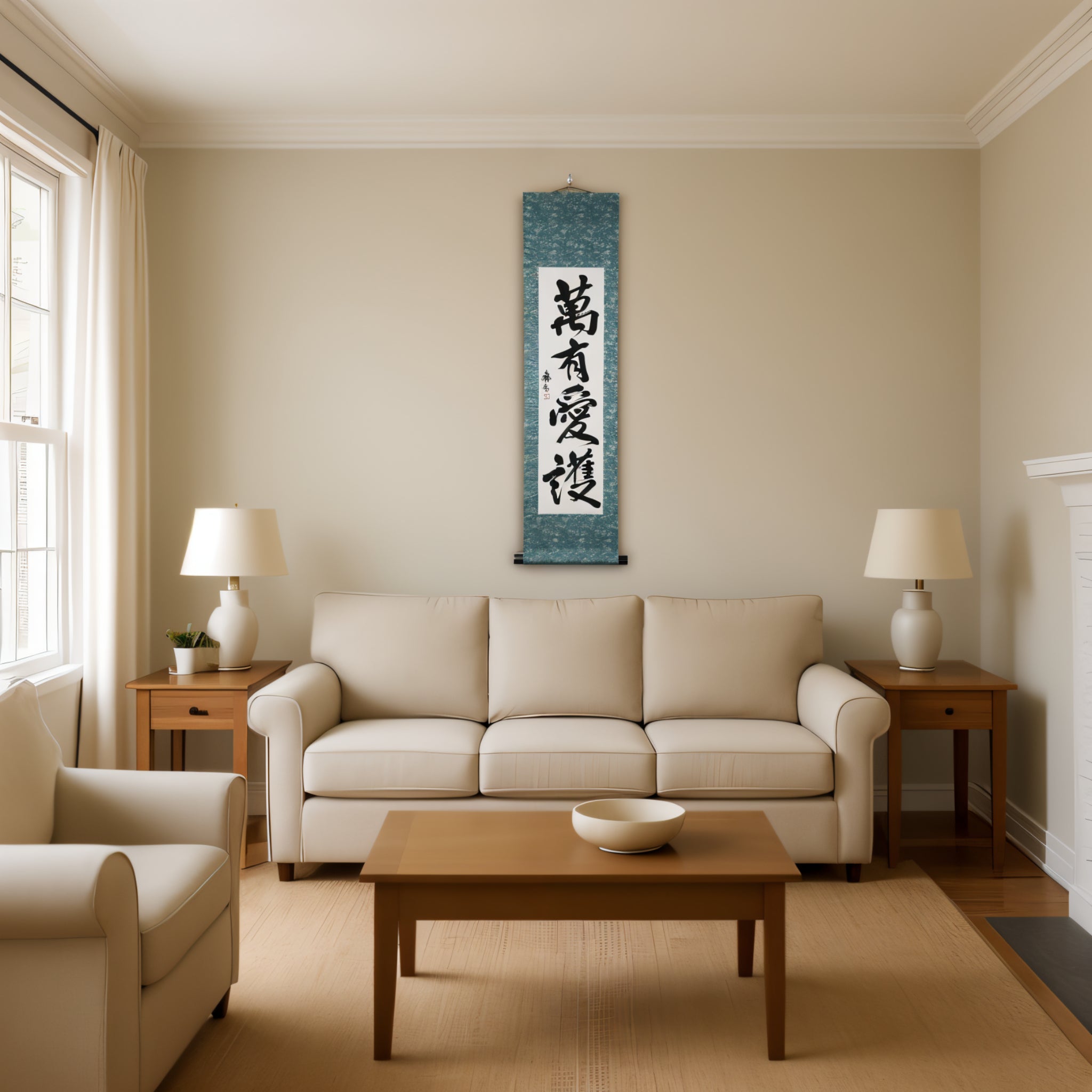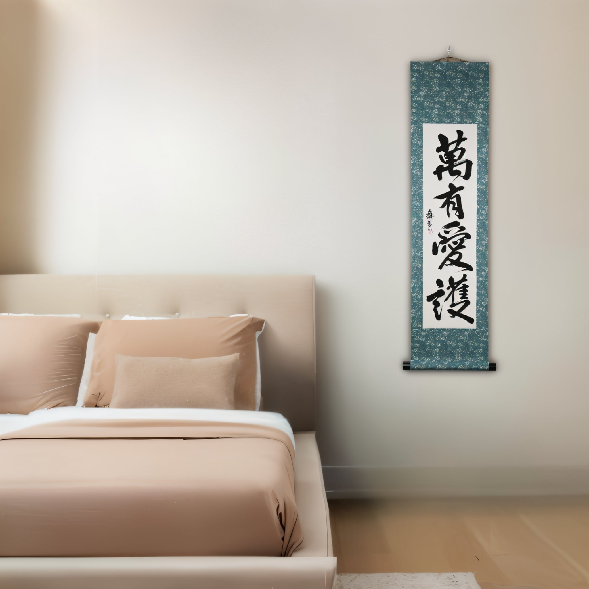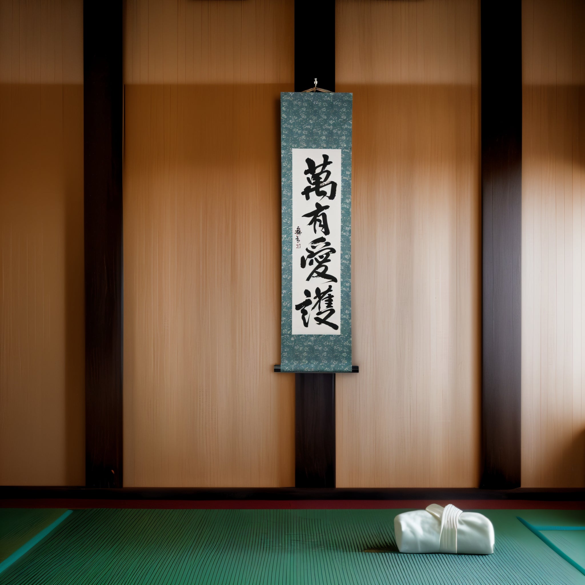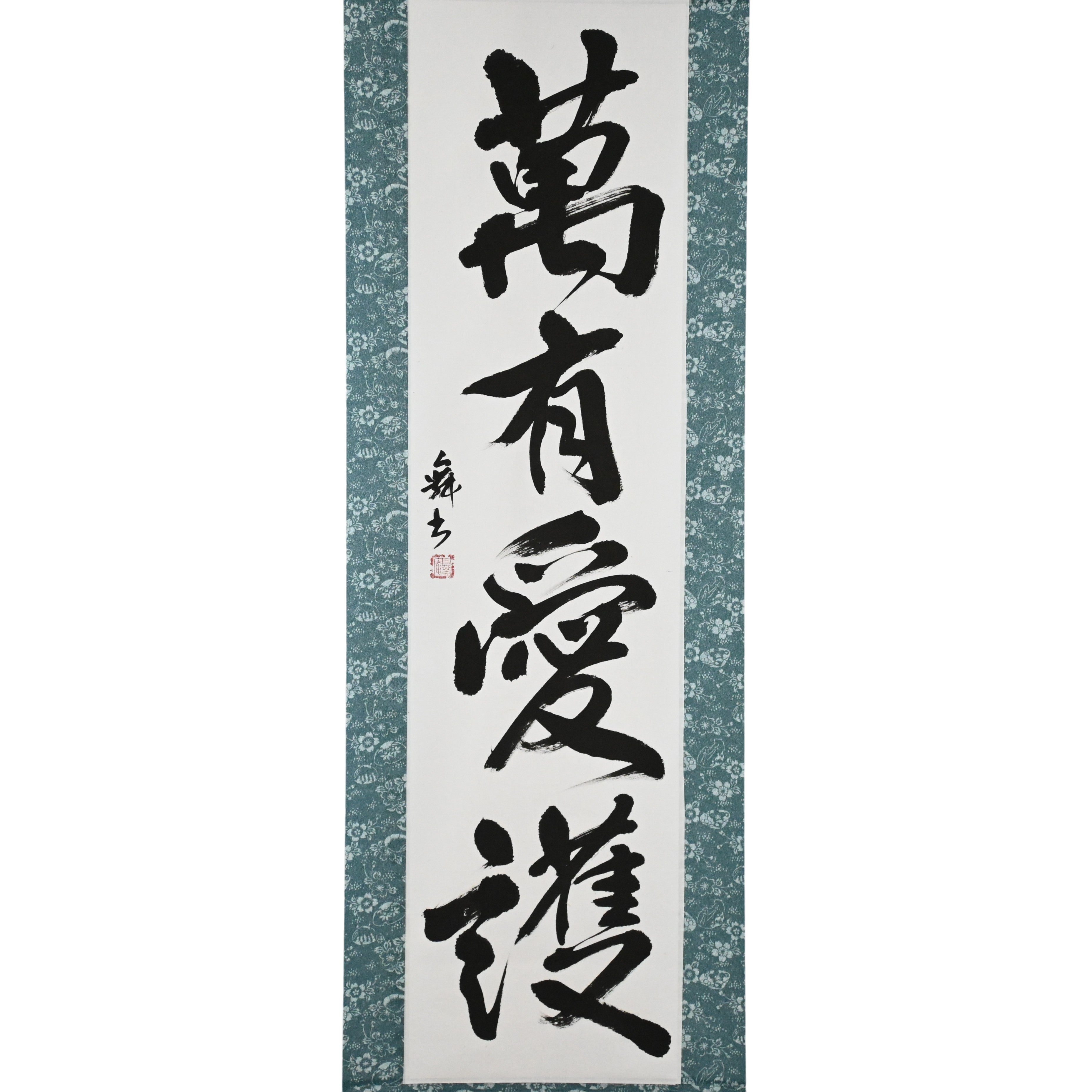 This Japanese calligraphy scroll features the powerful phrase 萬有愛護 (Banyū Aigo), meaning “Universal Love and Protection”.