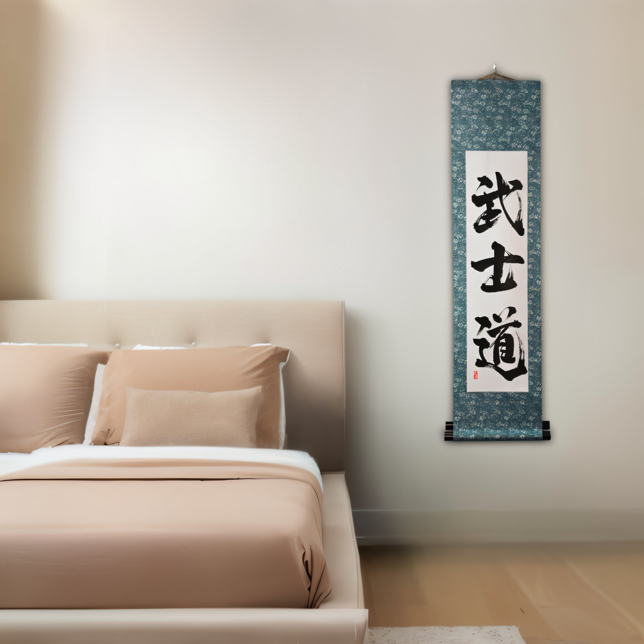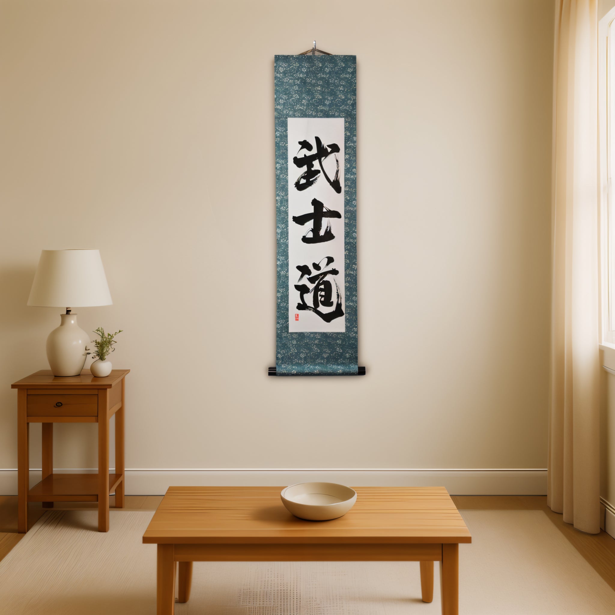 This calligraphy scroll features the powerful word 武士道 (Bushidō), which embodies the way of the Samurai.