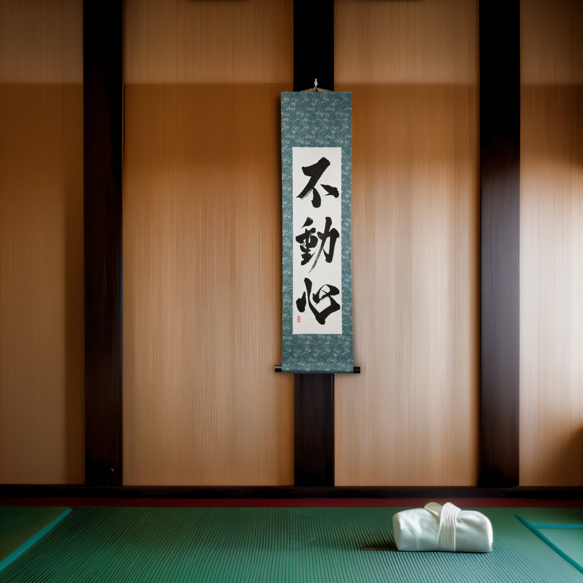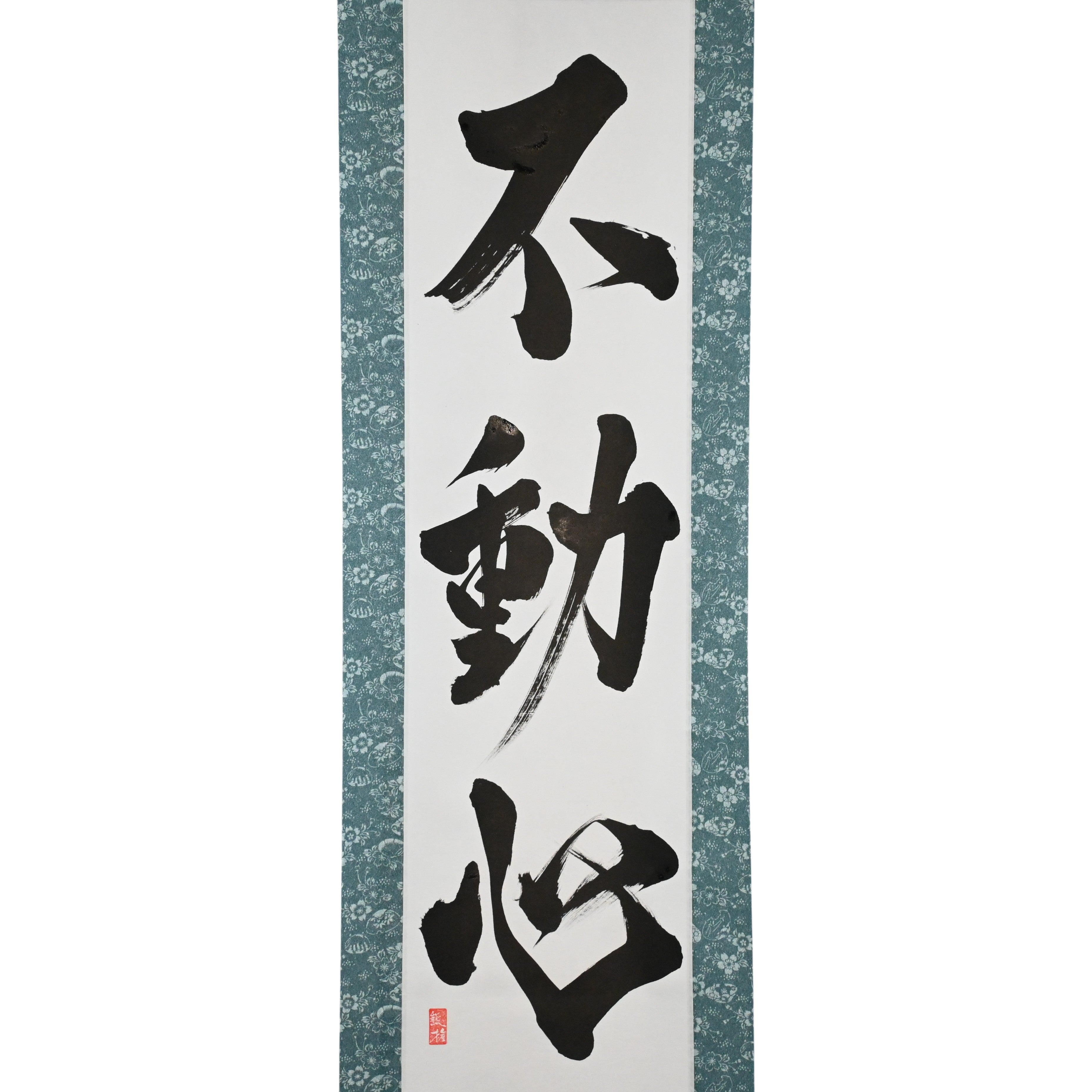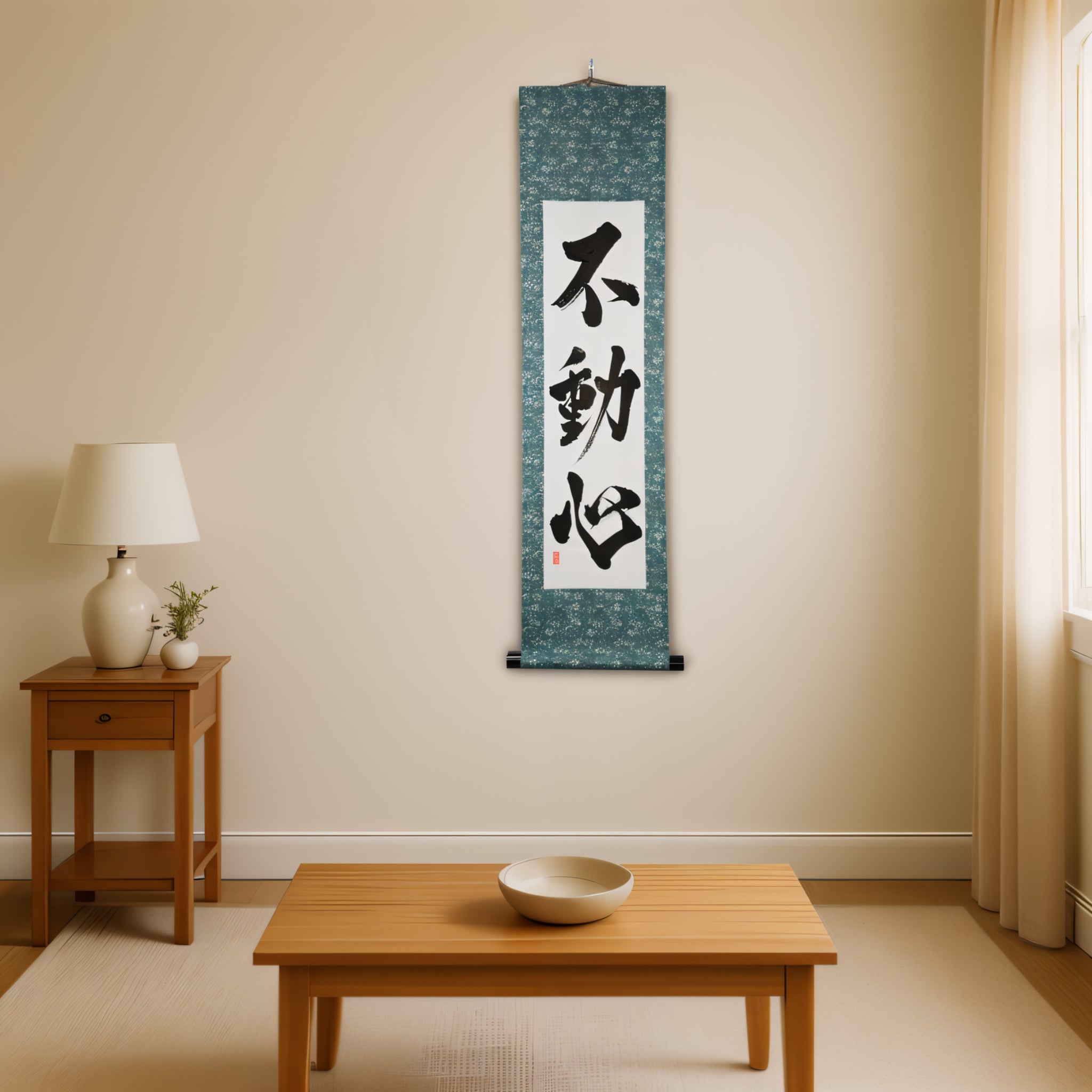 This calligraphy scroll features the profound concept of 不動心 (Fudōshin) — "the immovable mind". It represents a calm, centered state of being that remains unshaken by fear, anger, or doubt. In martial arts and the way of the Samurai, Fudōshin is considered essential to true mastery.