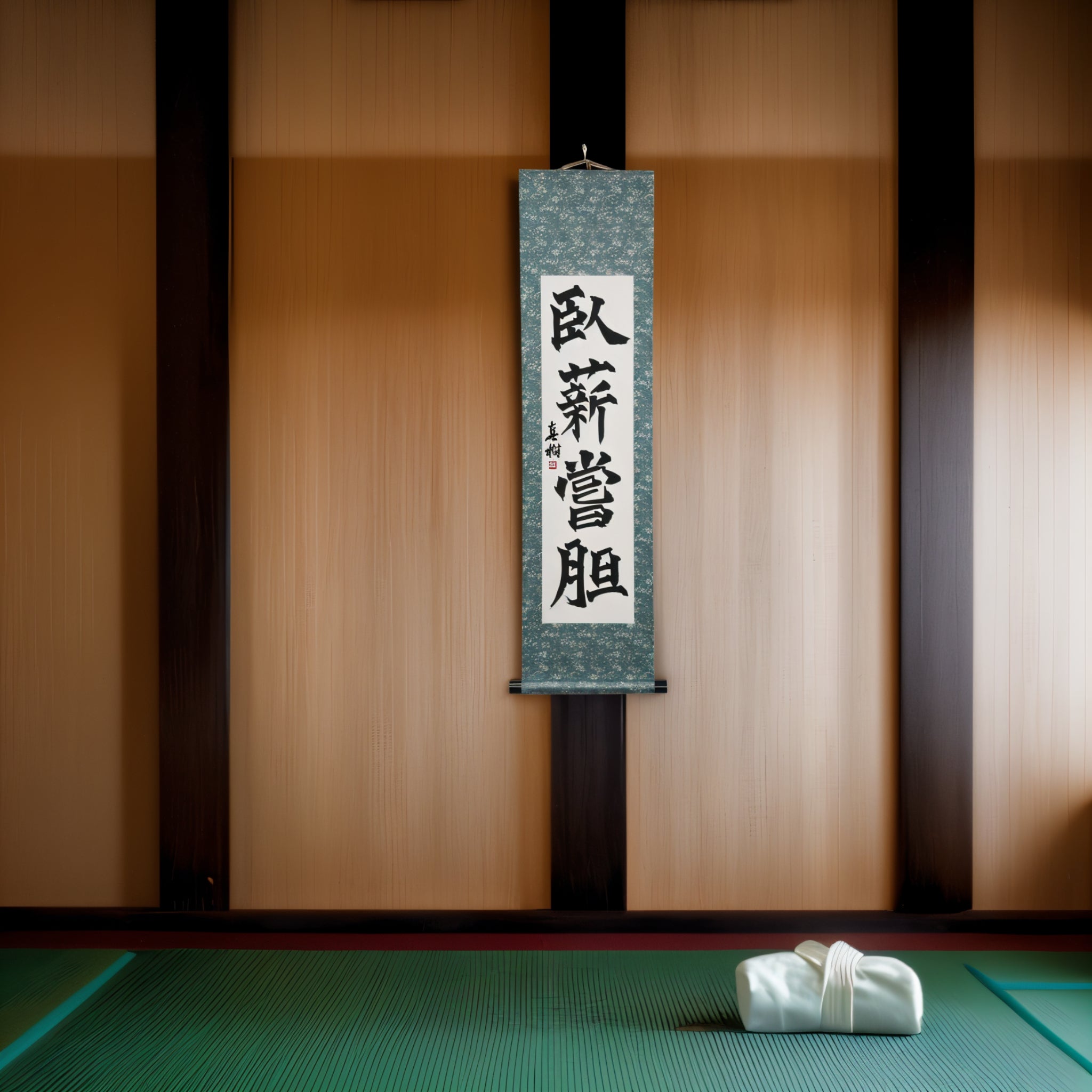 This Japanese calligraphy scroll features the powerful phrase 臥薪嘗胆 (Gashin Shōtan) — a timeless expression of patience, perseverance, and quiet determination on the samurai path.