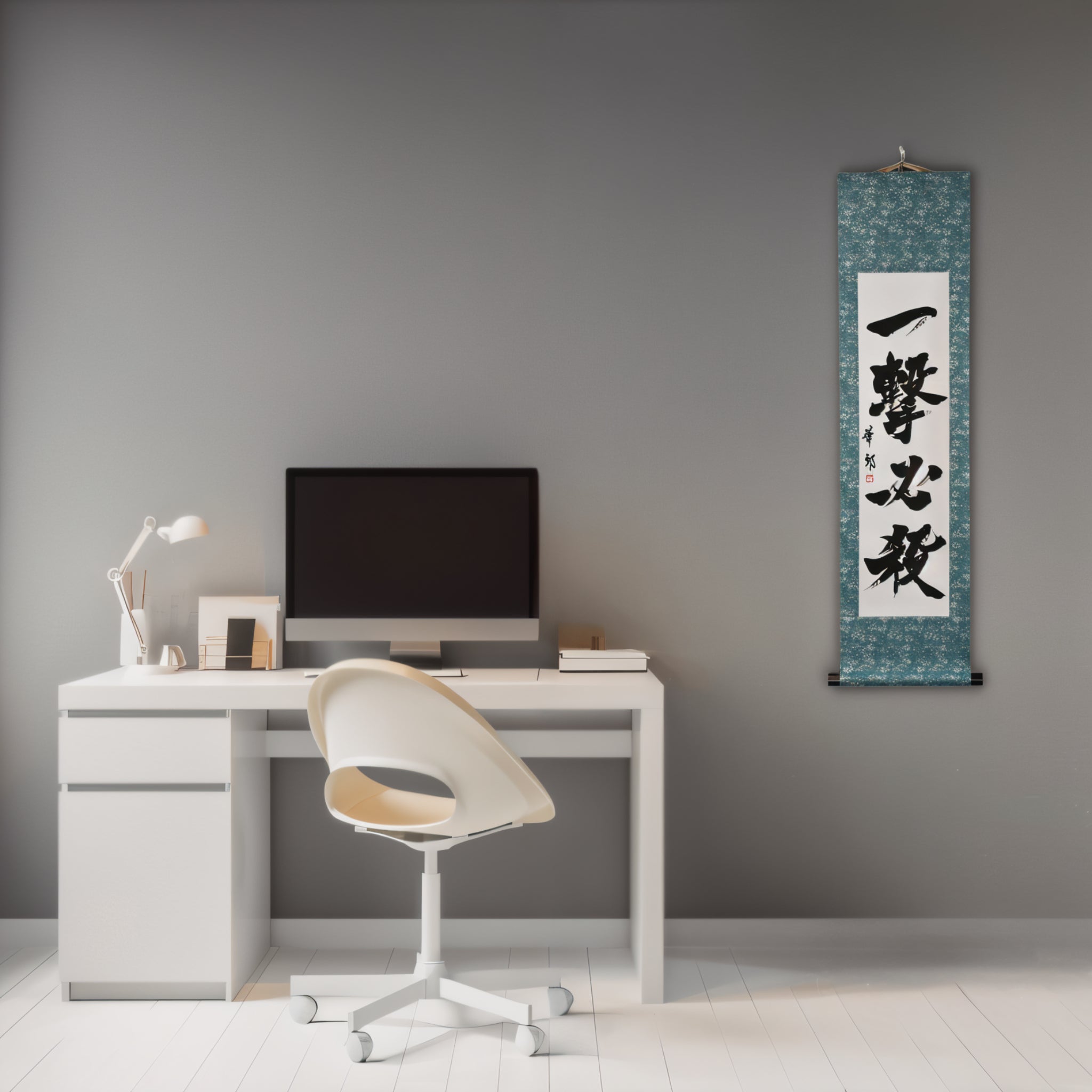Embodying the core philosophy of Karate, this striking Japanese calligraphy scroll features the phrase 一撃必殺 (Ichigeki Hissatsu) — meaning “One Strike, Certain Kill”. It reflects the ideal of delivering a single, precise, and decisive technique that ends the conflict in an instant.