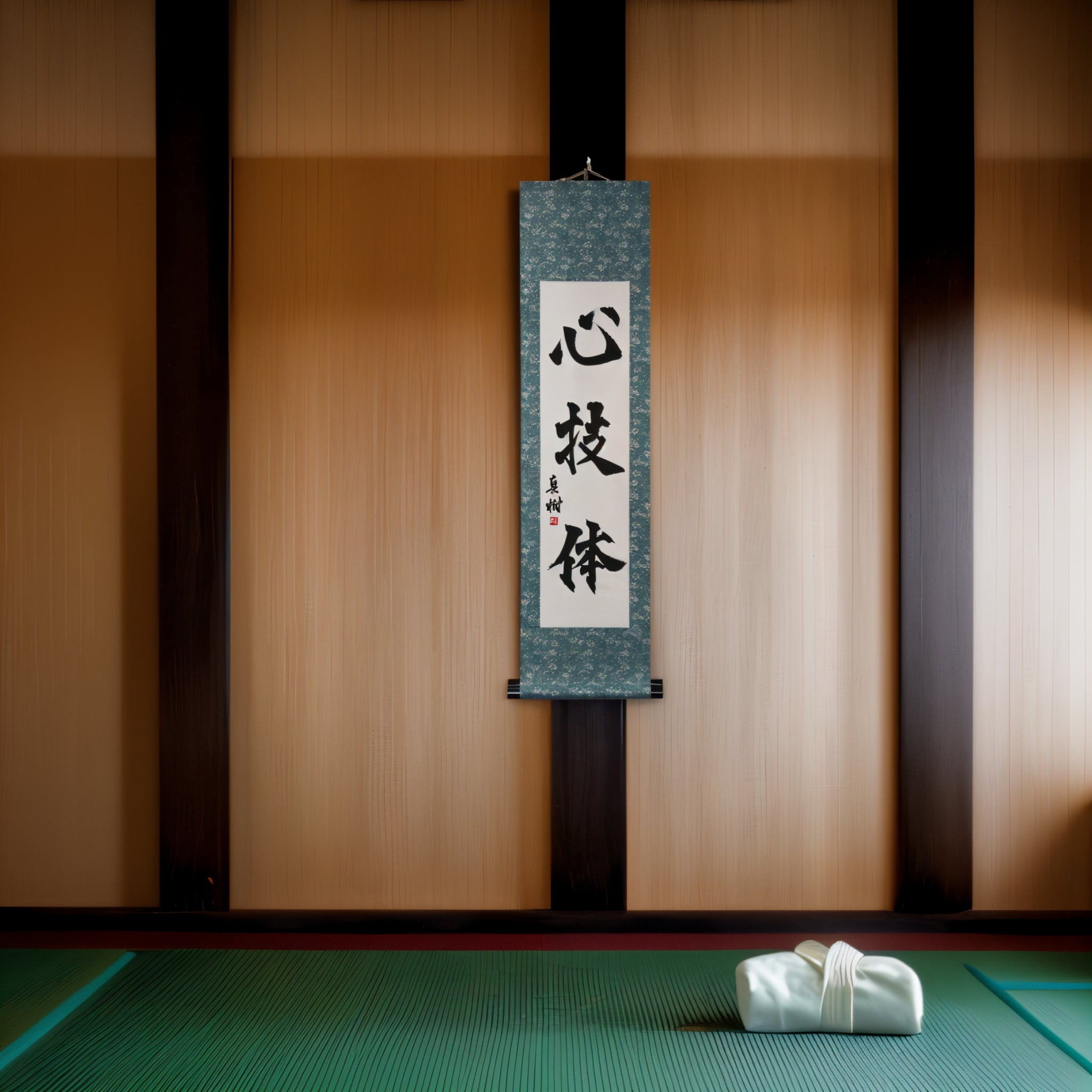 This Japanese calligraphy scroll features the revered phrase 心技体 (Shingitai) — the foundational concept behind all traditional Japanese martial arts, including Judo, Karate, Aikido, and more.