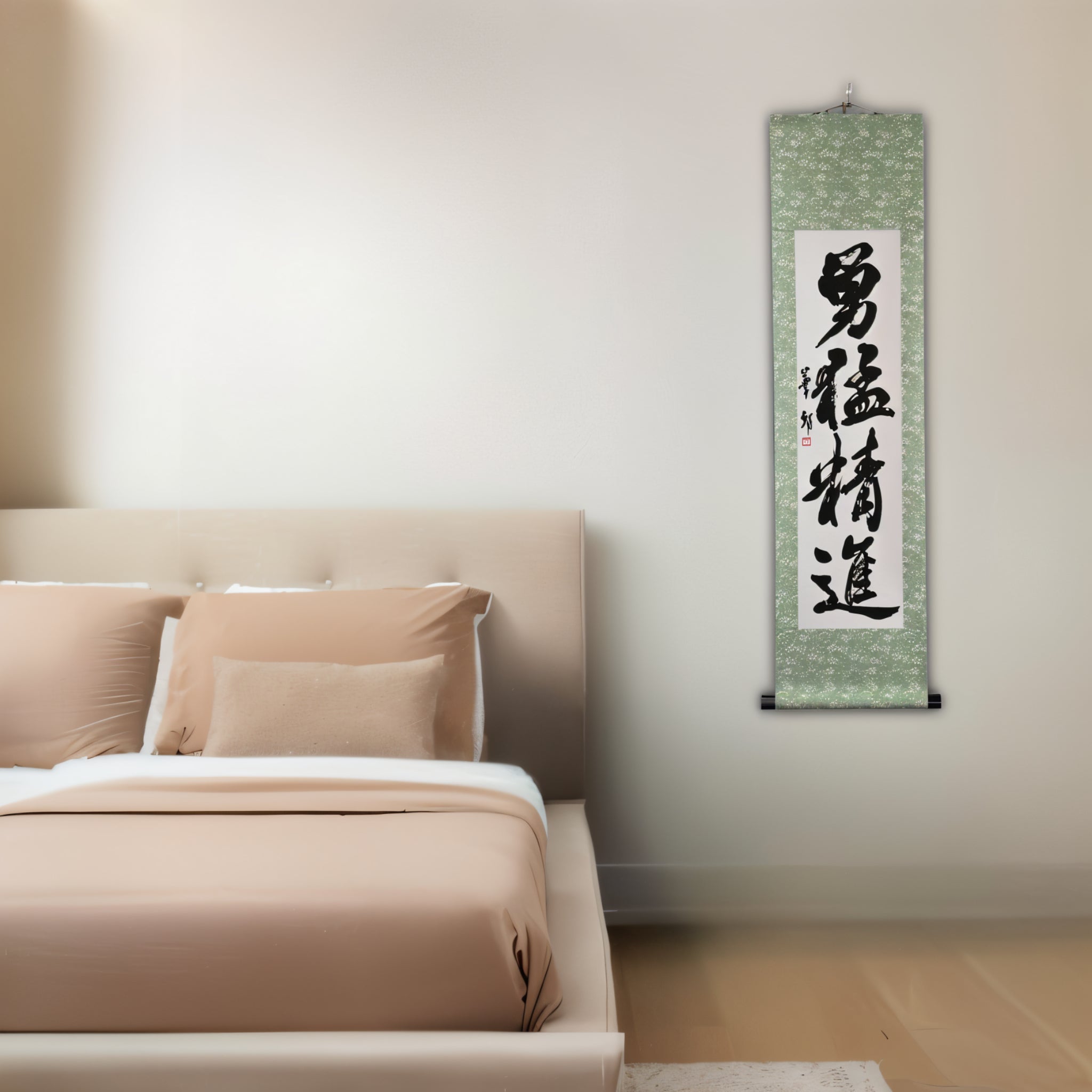 This Japanese calligraphy scroll features the powerful phrase 勇猛精進 (Yūmō Shōjin) — expressing courageous action and disciplined perseverance. Deeply rooted in the way of the Samurai, it reflects a Samurai’s resolve to face adversity without fear and to devote themselves fully to self-cultivation.